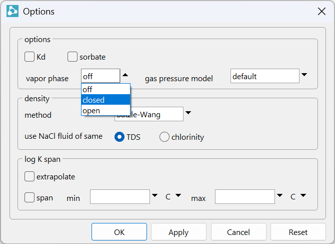 Toggle the vapor phase option to “closed” to allow evolved vapor to back react with the fluid or “open” to allow evolved gases to escape. X1t and X2t allows a vapor phase to form in an open system only.